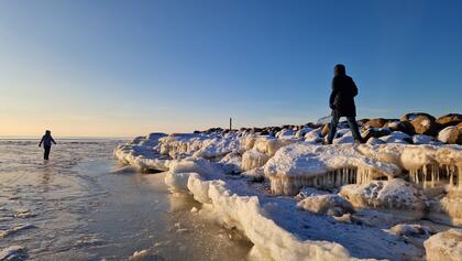 Nu atgriežamies pie Netīrajām dejām. Jūtam, ka esam pareizajā vietā, tomēr Viesu stāvvietas zīmes drusku biedē. Pārvaram bailes, un dodamies. Te nu katra kāja uz savu pusi slīd, akmeņi apsniguši - neredz, vai kāju liek apsnigušā tukšumā vai uz slidena akmens. Tomēr līdz ko pamanam taciņu pa noledojušu “palodzi” mola malā, esam zirgā un varam turpināt.